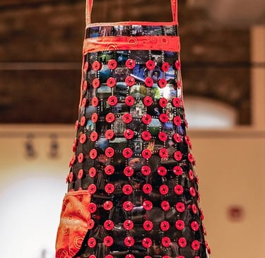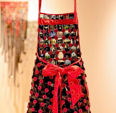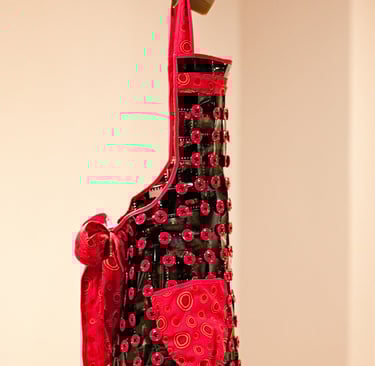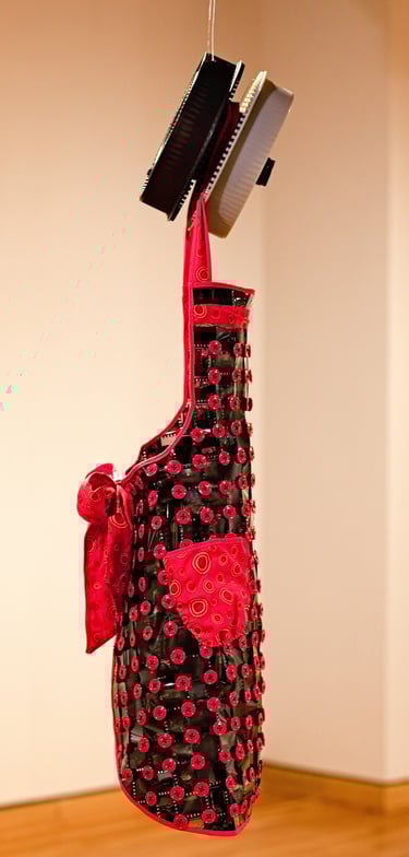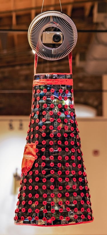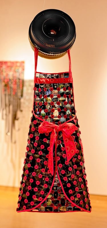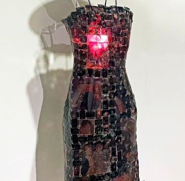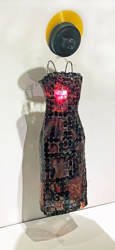 Materials Used: Images of women - slides removed from frames, transparencies of art once used to teach art history, transparent images of friends stitched to nylon netting with crochet thread over an annealed steel wire armature. Camera, slide carrousel, translucent vinyl LP head. LED light inside a heart made of found plastic and red fabric. Electrical wire can be oriented up to the ceiling or down out of the bottom of the dress.