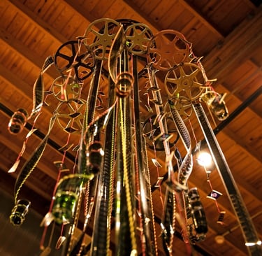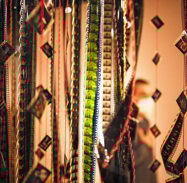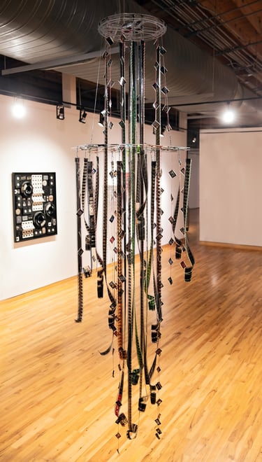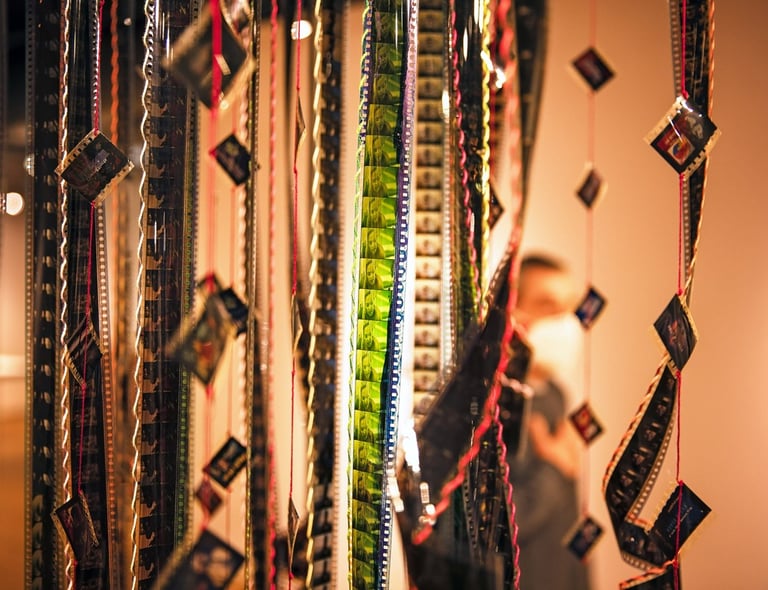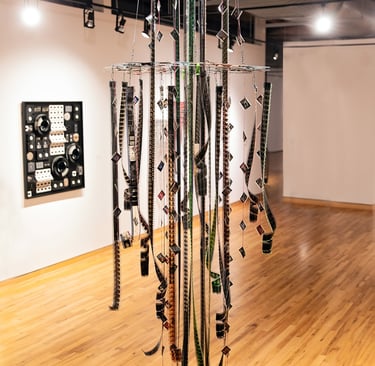 Dimensions: 9.5’ X 3’ Materials Used: 35mm movie film, buttons, crochet thread, movie reels, Slide film positives, with movie trivia and refreshment advertisement.