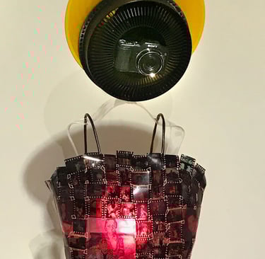 Materials Used: fabric, slides stitched with crochet thread and buttons, slide carrousel head, camera face.