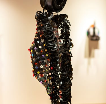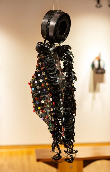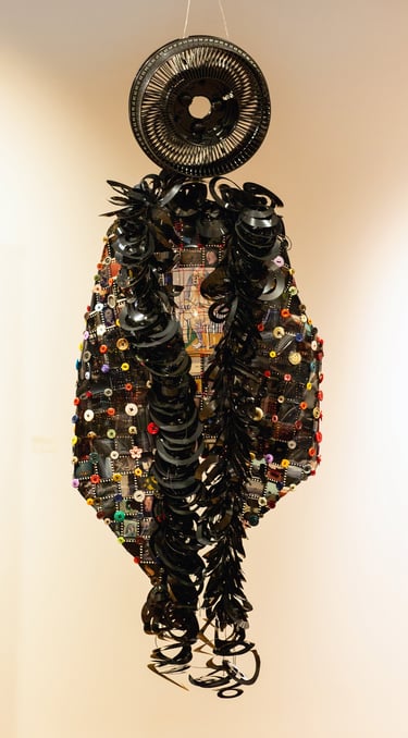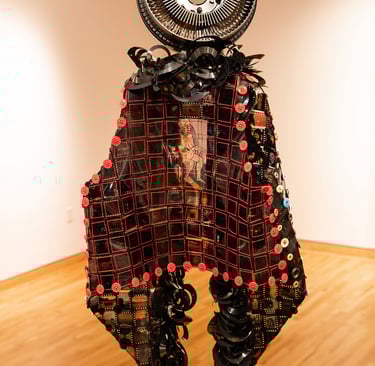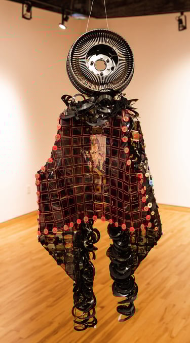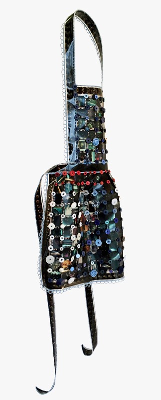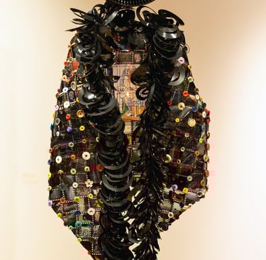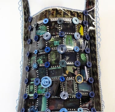 Materials Used: slides removed from slide mounts, overhead transparency, crochet thread and buttons. Floppy disks as fringe, Plexiglas shoulders and slide carrousel head.