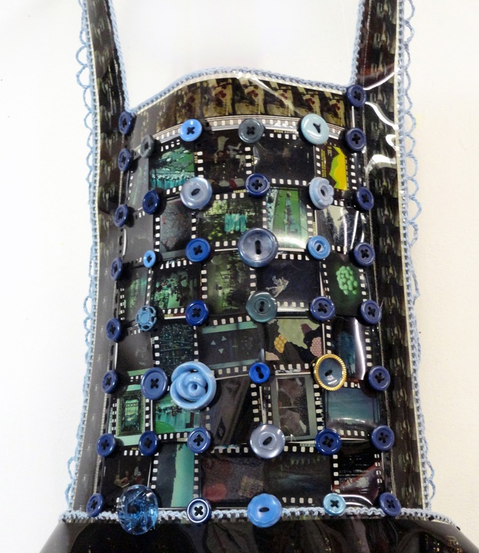 Materials Used: 35mm film and slides stitched with crochet thread, buttons, and slide carrousel head, Plexiglas shoulders.