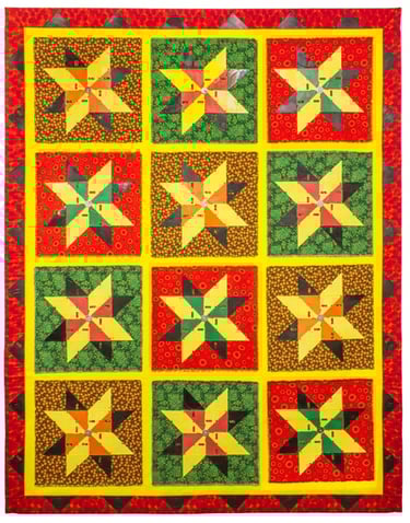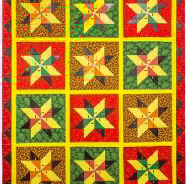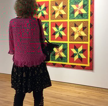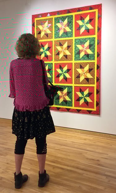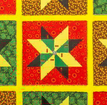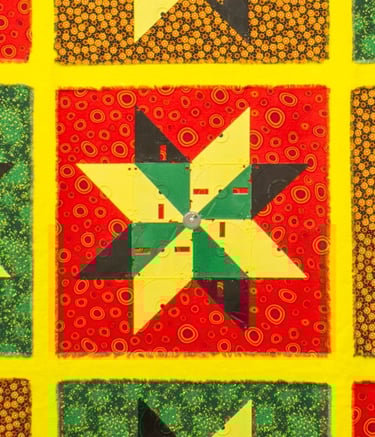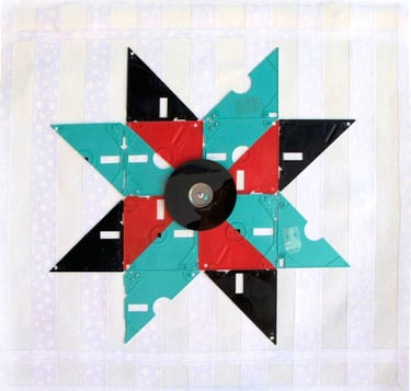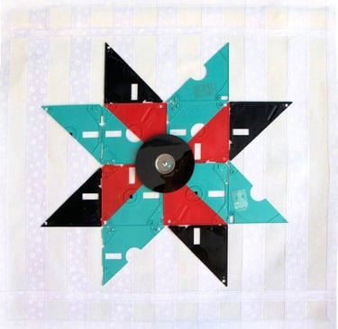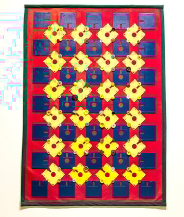 Materials Used: Materials Used: Acrylic paint, Fabric, canvas, 110 - green, orange, red, yellow, and black floppy disks. A flat bar is at the top for hanging. Floppy disks are opened cut and reassembled to resemble traditional quilt patterns.