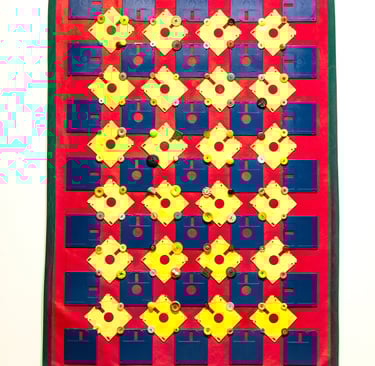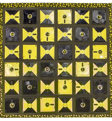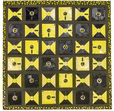 Materials Used: Acrylic paint, canvas, yellow and black floppy disks, attached using rivets and construction adhesive