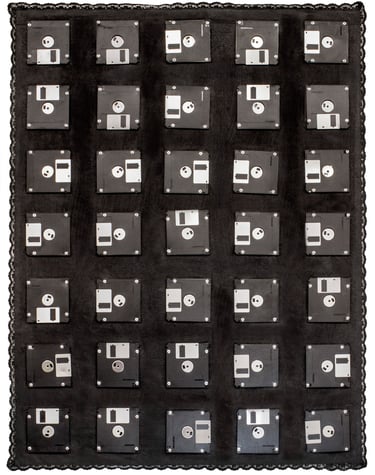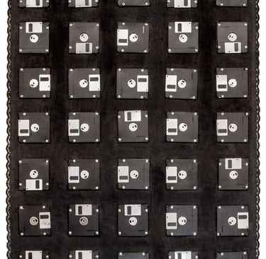 Materials Used: Acrylic paint, Fabric, canvas, floppy disks, buttons